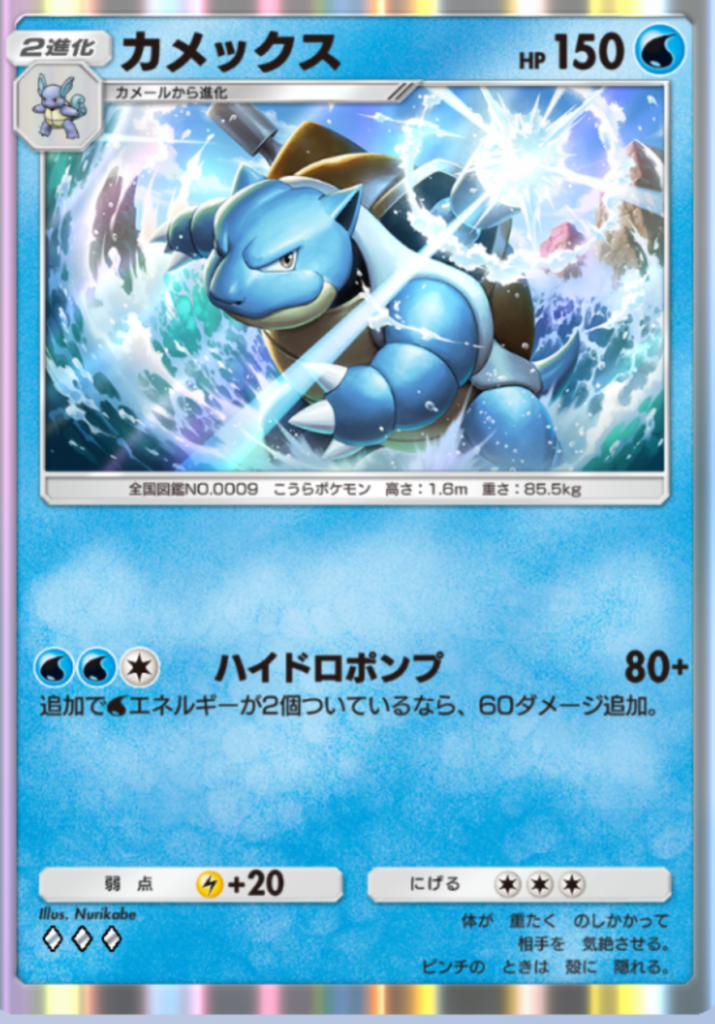 カメックスexでいい、とにかくこのカードはその一言に尽きる。exとコンセプトが丸被りしているためやることは何も変わらない。エネルギーを5個供給して毎ターン超火力を出し続ける……と言いたいのだが非exカメックスは最高打点は140止まりである。